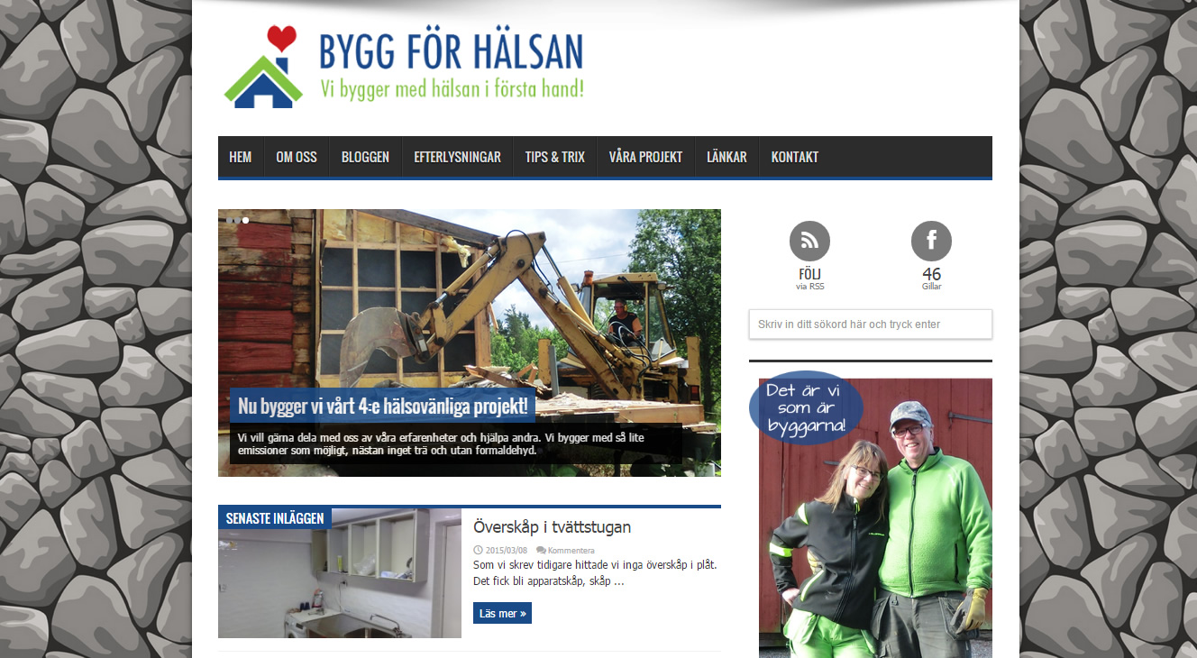 Bygg för hälsan är bloggen där vi får följa Leffe och Lenas byggprojekt. Det unika med denna blogg är paret bygger med hälsovänliga material, då Lena är känslig för kemikalier. På bloggen finns massa tips & trix för olika utmaningar man kan stöta på vid husbyggnadet. Bloggen uppdateras frekvent med härliga blogginlägg och bilder.