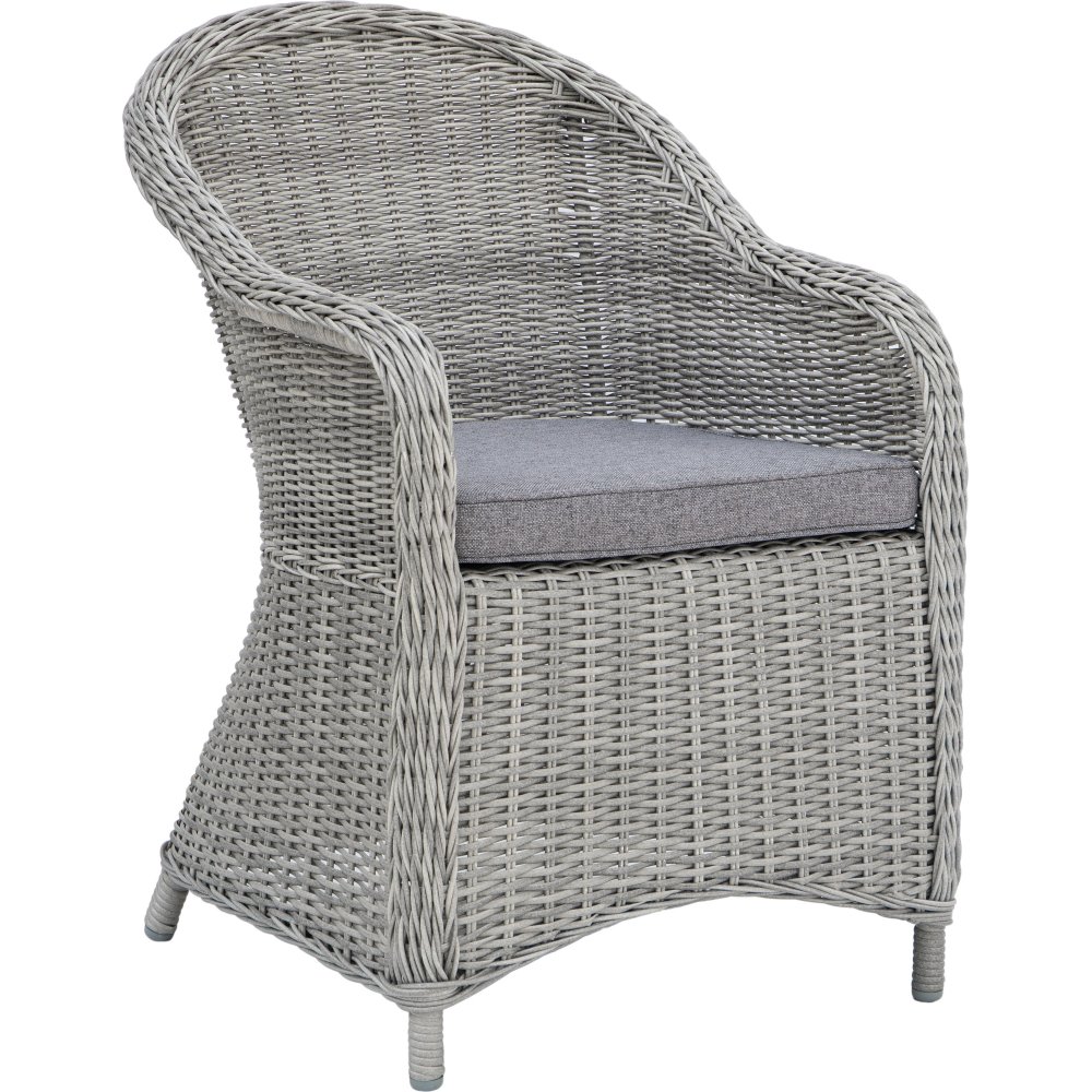 Matgrupp innehållande 1 st runt matbord i grå konstrotting med härdat glas som toppskiva, inklusive 4 st Mercury fåtöljer i matchande grå konstrotting med sittdyna och ryggdyna för bästa komfort. Matgruppen passar perfekt på altanen, uteplatsen och i uterummet.