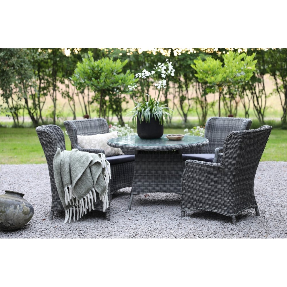 Utematgrupp runt bord 110 cm konstrotting 4 fåtöljer + Textilimpregnering för utemöbler
