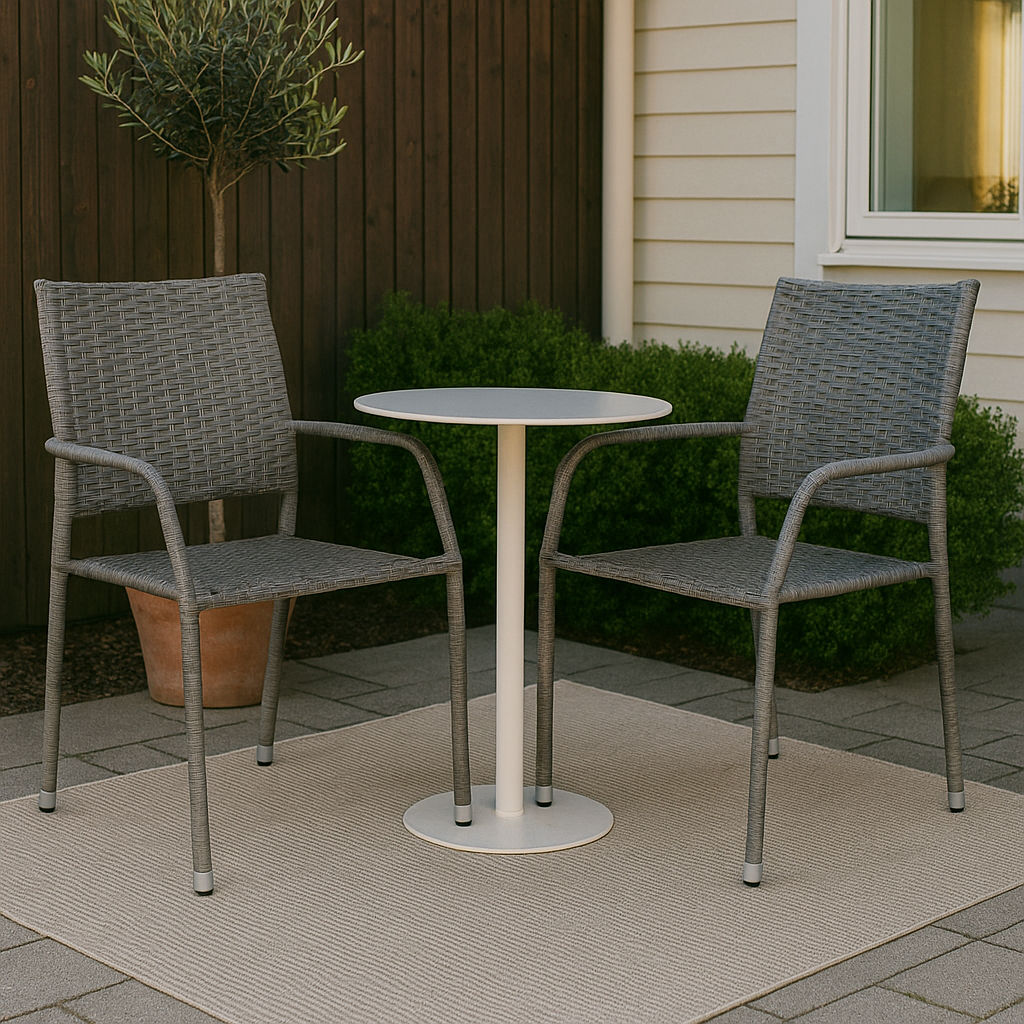 Las Vegas-bordet på 150 cm passar utmärkt på mindre altaner, terrasser och balkonger där du vill ha plats för både gäster och rörelse. Ida-stolarna är nätta, bekväma och enkla att placera kring bordet – och när de inte används kan de enkelt staplas för att spara plats.